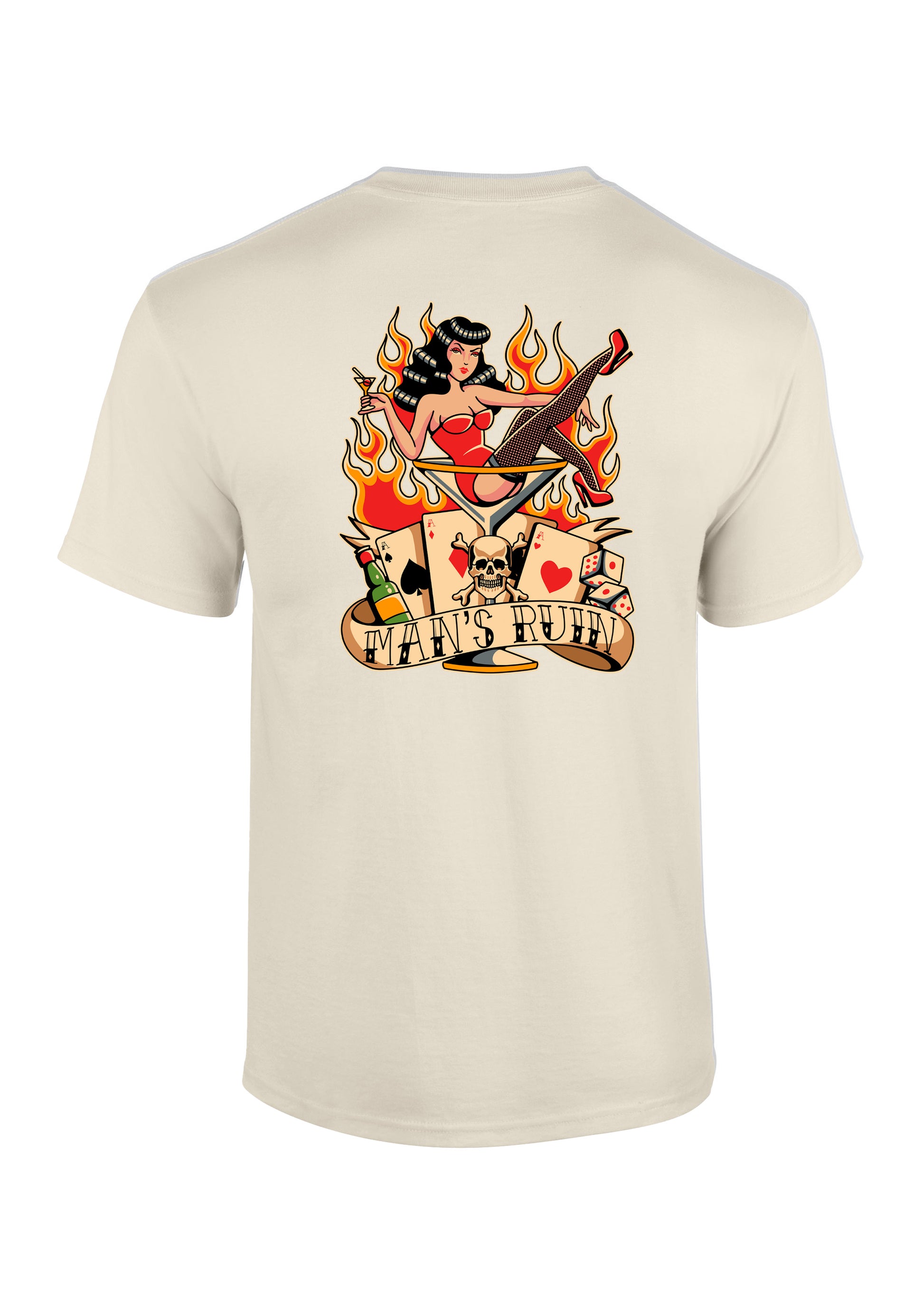 Fire, lust, and luck. Man’s Ruin is old-school sin in pure tattoo form.